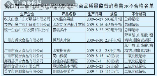 海口市工商局上周发布消费警示称,农夫山泉广东万绿湖有限公司生产的农夫果园30%混合果蔬(生产日期:2009-6-27,规格:500毫升/瓶)、水溶C100西柚汁饮料(生产日期:2009-8-16,规格:445毫升/瓶),以及统一企业(中国)投资有限公司生产的蜜桃多汁(生产日期:2009-8-22,规格:250毫升/瓶),总砷超标。