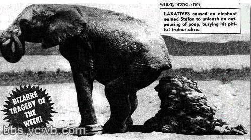 据英国《太阳报》报道,该书声称德国帕德伯恩动物园的一位饲养员,给一头便秘的大象一口气服下廿二包泻药。 饲养员接着站在它的身后观察泻药是否有效。 不料大象的肚肠开始剧烈蠕动时,粪便如山泥般倾泻下来,该饲养员未能及时躲开,竟然被活生生淹死。